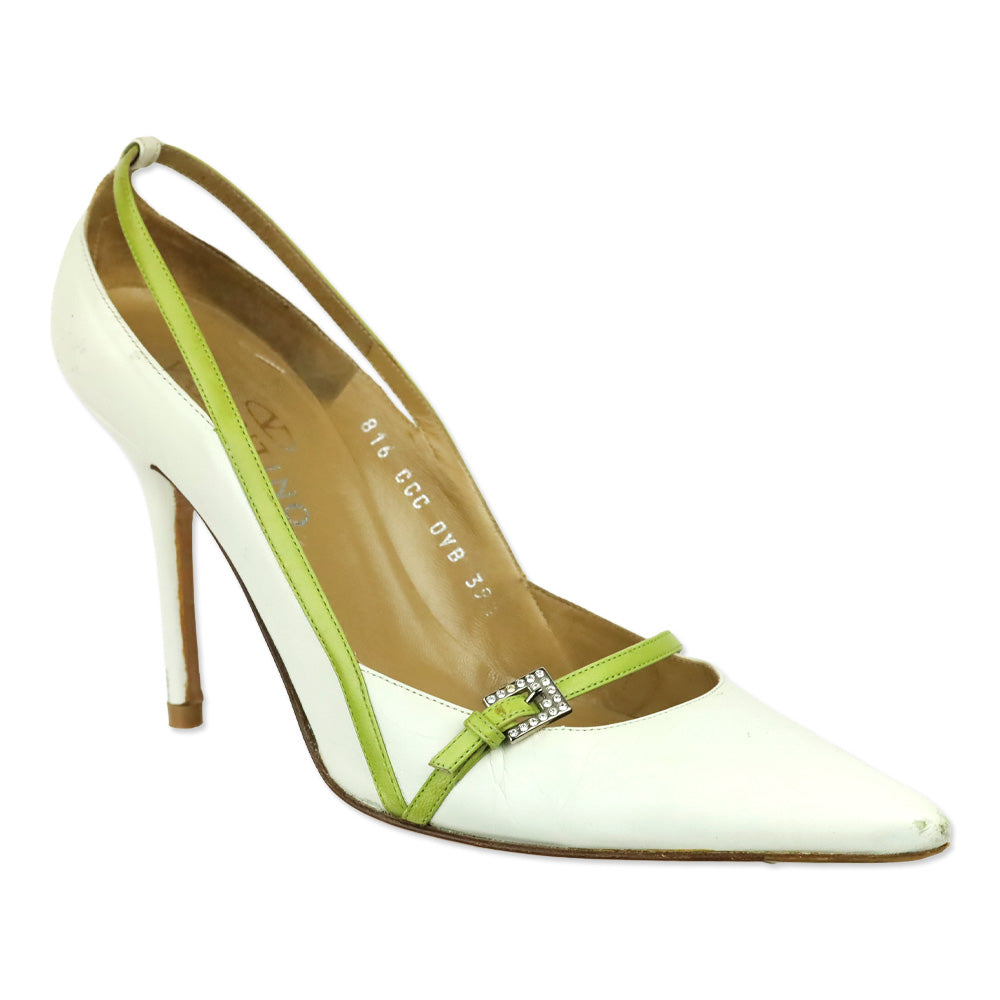Valentino Garavani White Leather Crystal Buckle Strap Pump