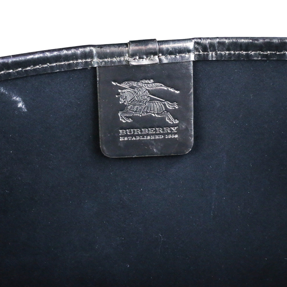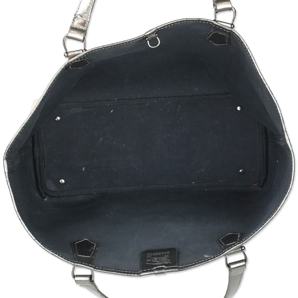 Burberry tote bag, Supernova Check, Large Nickie Tote, metallic patent leather, designer handbag, removable wristlet, authentic Burberry, pre-owned luxury, fashion resale, gunmetal silver.