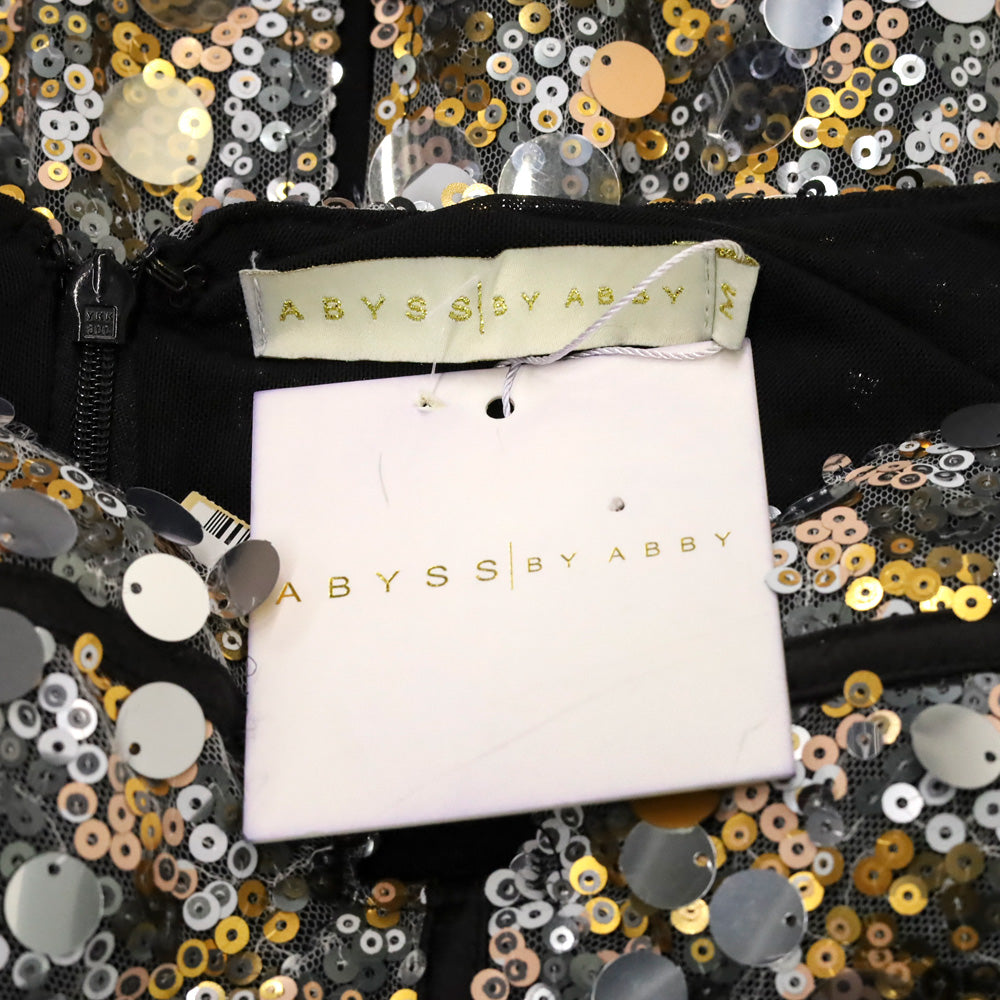 Turn heads in the show-stopping Tatiana dress by Abyss by Abby. This striking evening gown features a mesmerizing mesh base embroidered with chunky, alternating-sized sequins in a brilliant gold and silver motif. The design is structured with a contrasting grey bustier-style bodice and a romantic sweetheart neckline, supported by delicate thin straps. With built-in breast pads for a seamless fit and a sophisticated back hem slit for ease of movement, this gown is the ultimate choice for red carpets, galas, or high-glamour events.