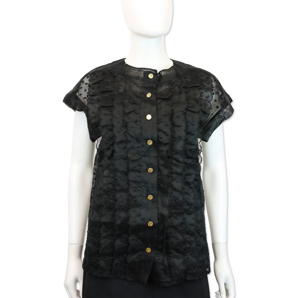 Chanel Black Sheer Dotted Ruffle Cap Sleeve Button Up Top
