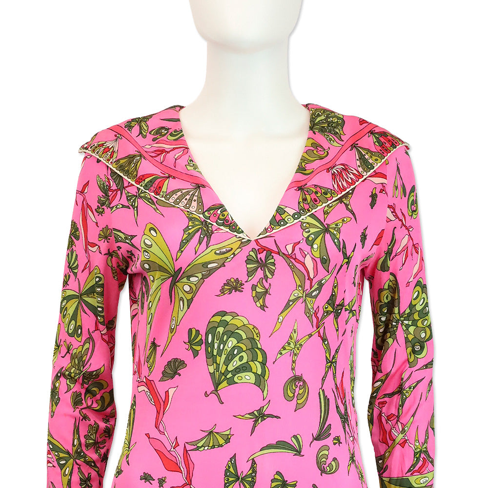 Own a piece of fashion history with this vintage Emilio Pucci midi dress, created exclusively for Saks Fifth Avenue. This rare "fit and flare" silhouette is rendered in a vibrant pink and green paisley print featuring delicate butterfly motifs. The dress is defined by a dramatic wide shawl collar leading into a flattering V-neckline and long, elegant sleeves. Crafted from a smooth synthetic jersey that maintains its shape and color brilliance, this is a timeless example of the "Prince of Prints" legendary Italian artistry.