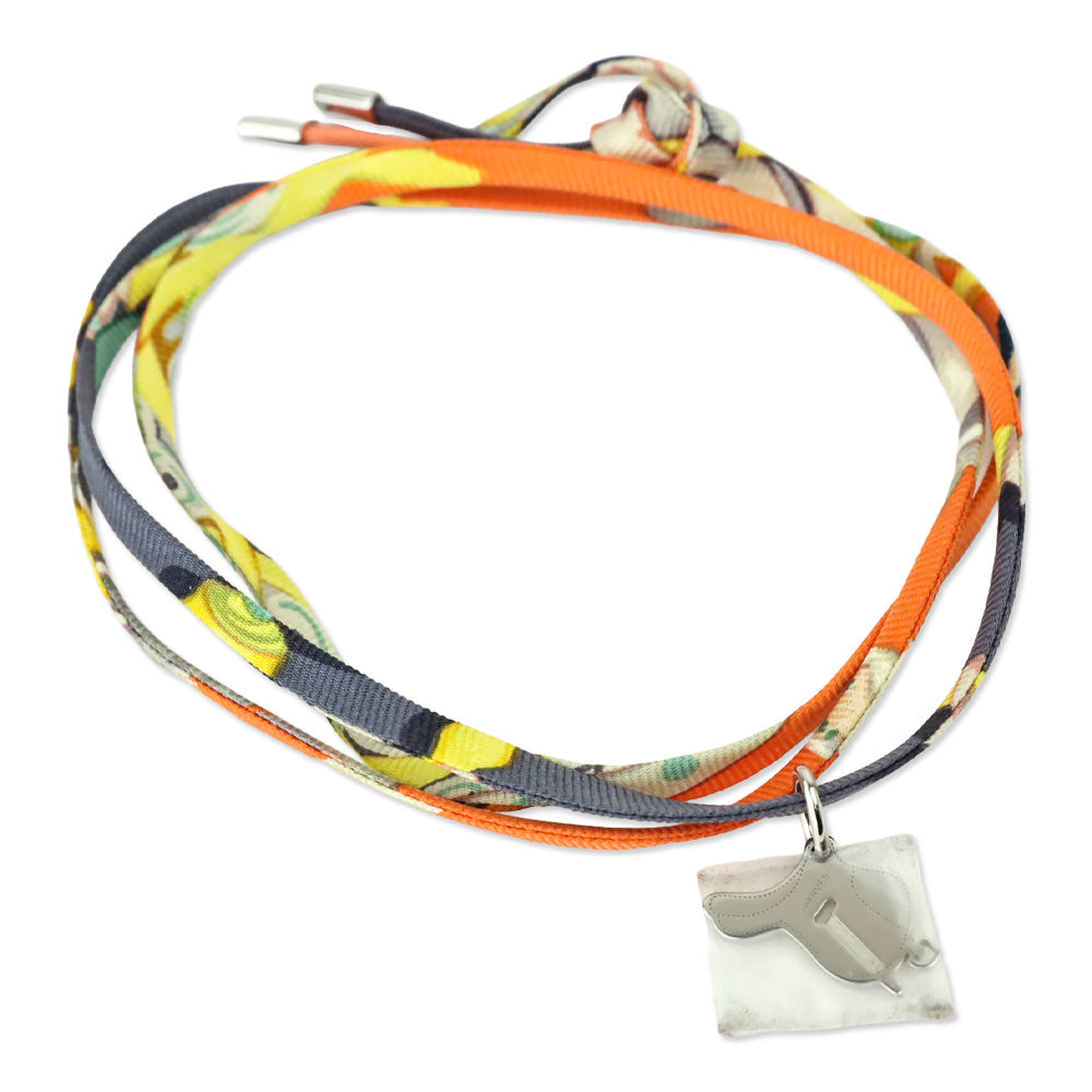 Hermès Orange Silk Silver Saddle Charm Tourbillon Necklace
