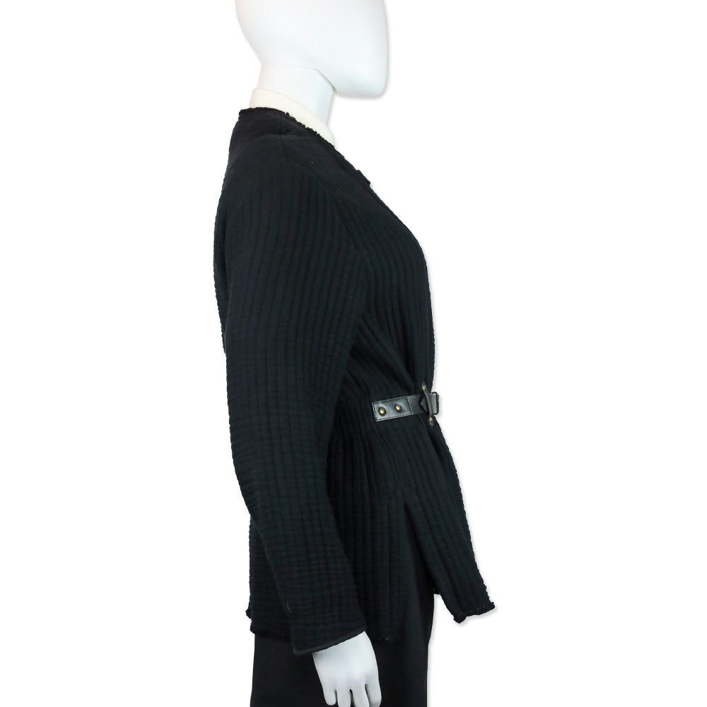 • Details: Jacket, Buckle Front Closures (Leather Belt), Side Slit Pockets, Elastic Back, Side Slit Detail, Fringe Trim, Raw Hem