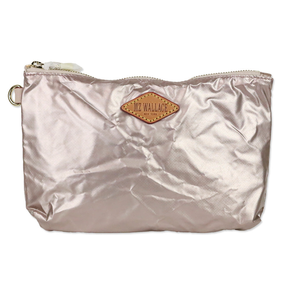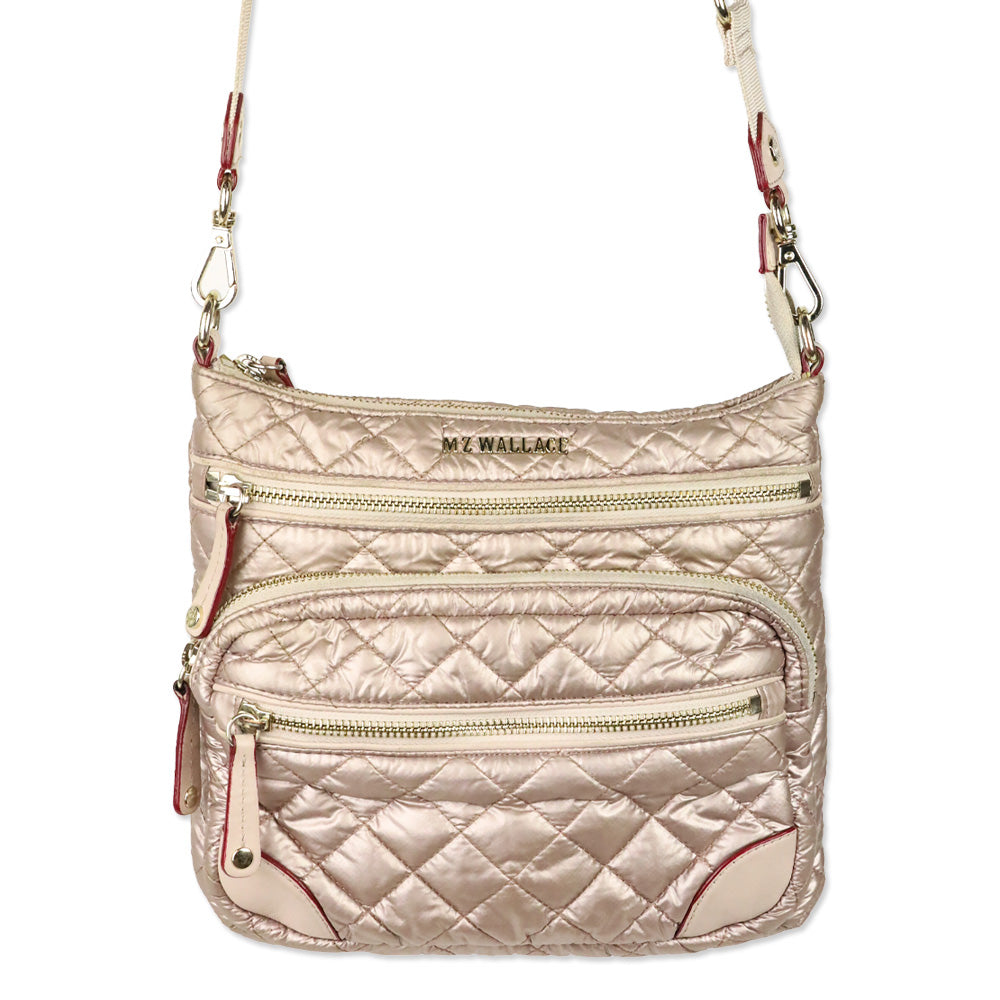 The MZ Wallace Metallic Rose Gold Downtown Crosby Crossbody pairs polished metallic sheen with practical organization. Lightweight and versatile, it features multiple detachable strap options and a compact silhouette ideal for day-to-night wear.