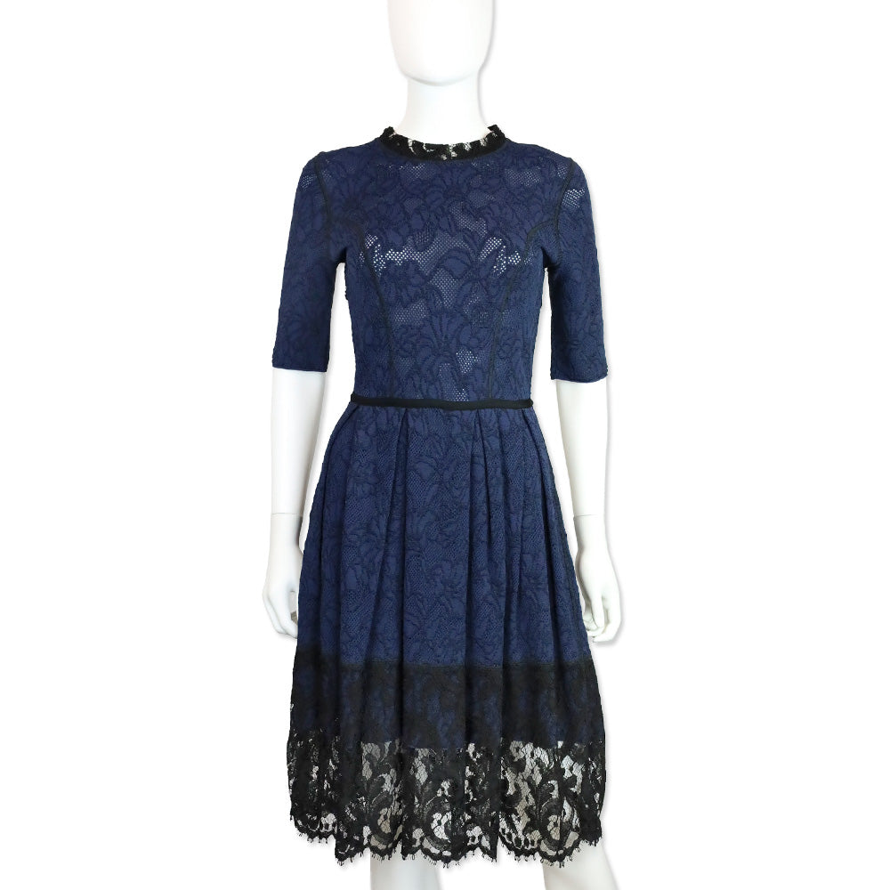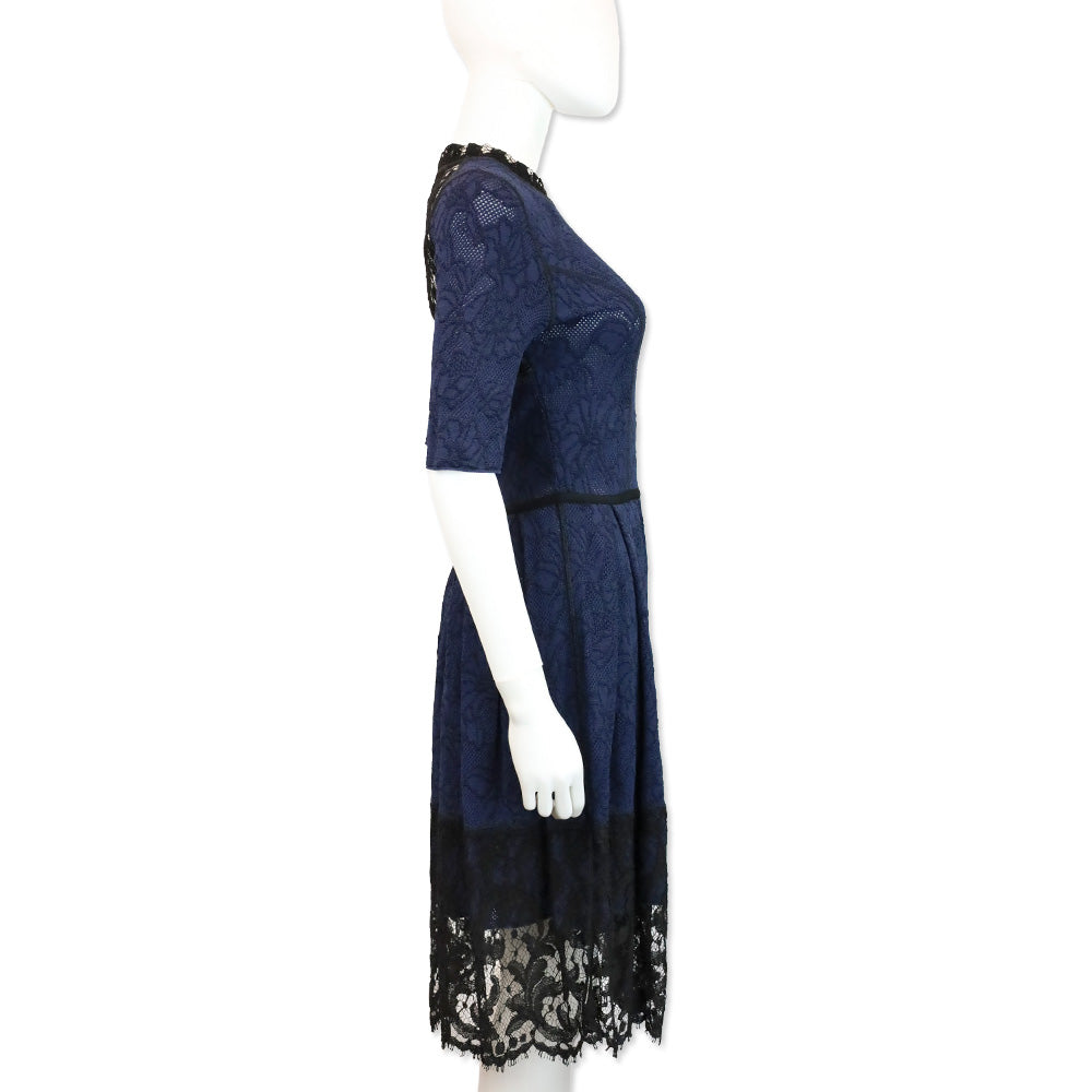Oscar de la Renta Blue & Black Floral Knit Lace Trim Midi Dress