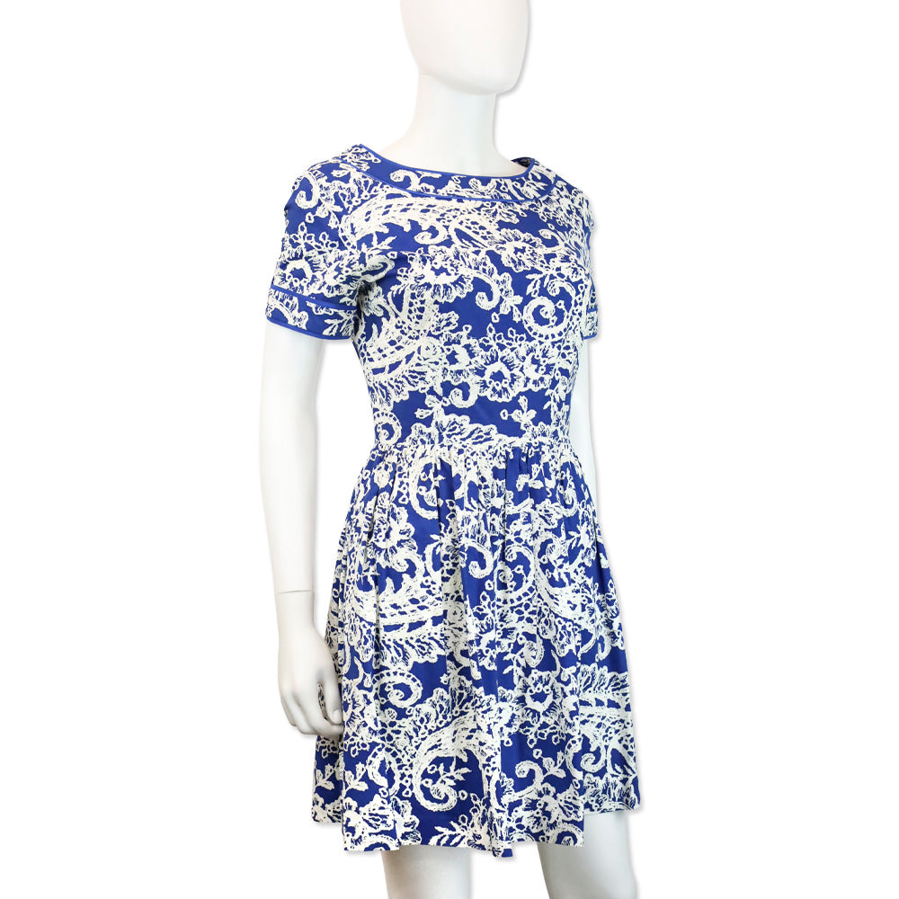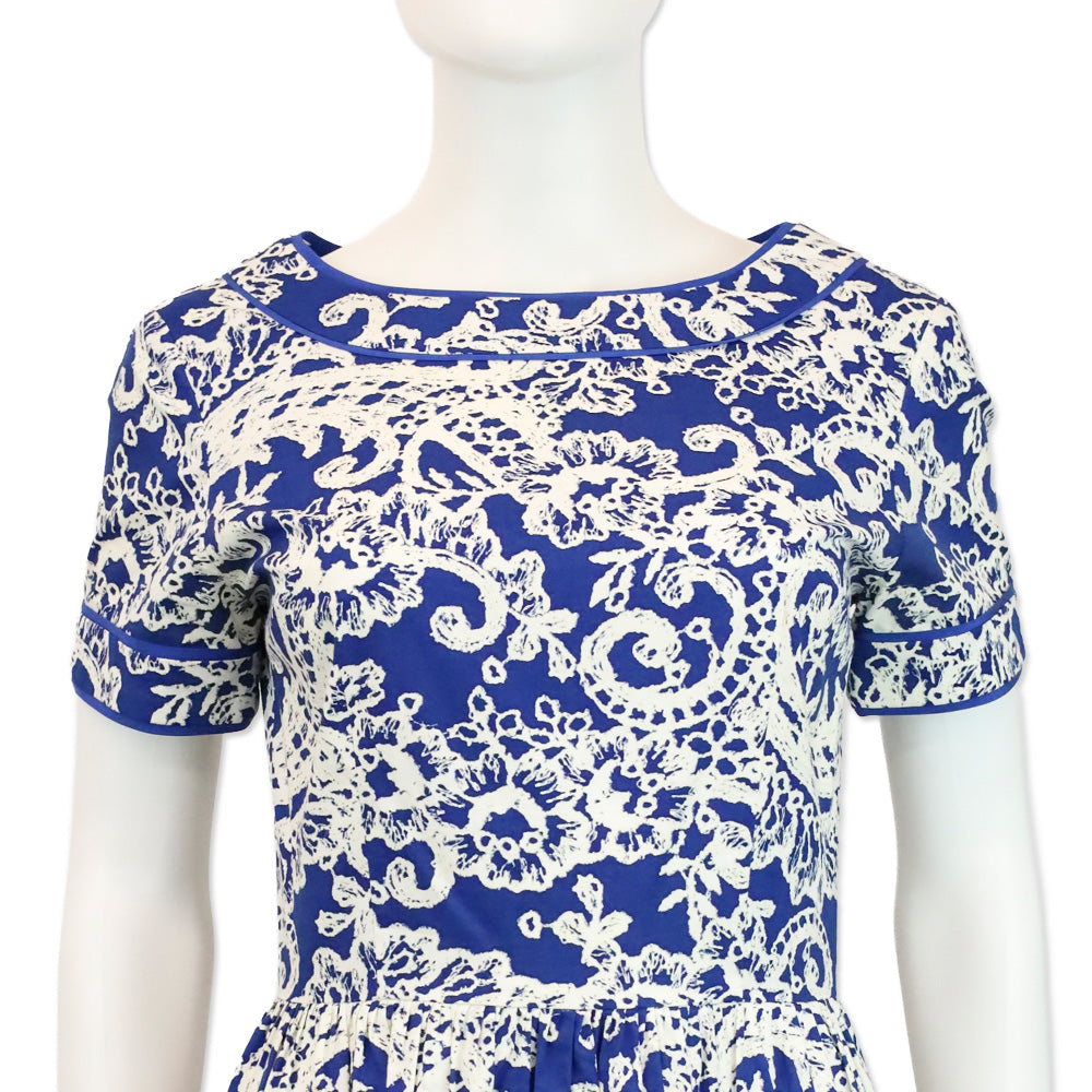 Oscar de la Renta Blue & White Brocade Cotton Print Mini Dress