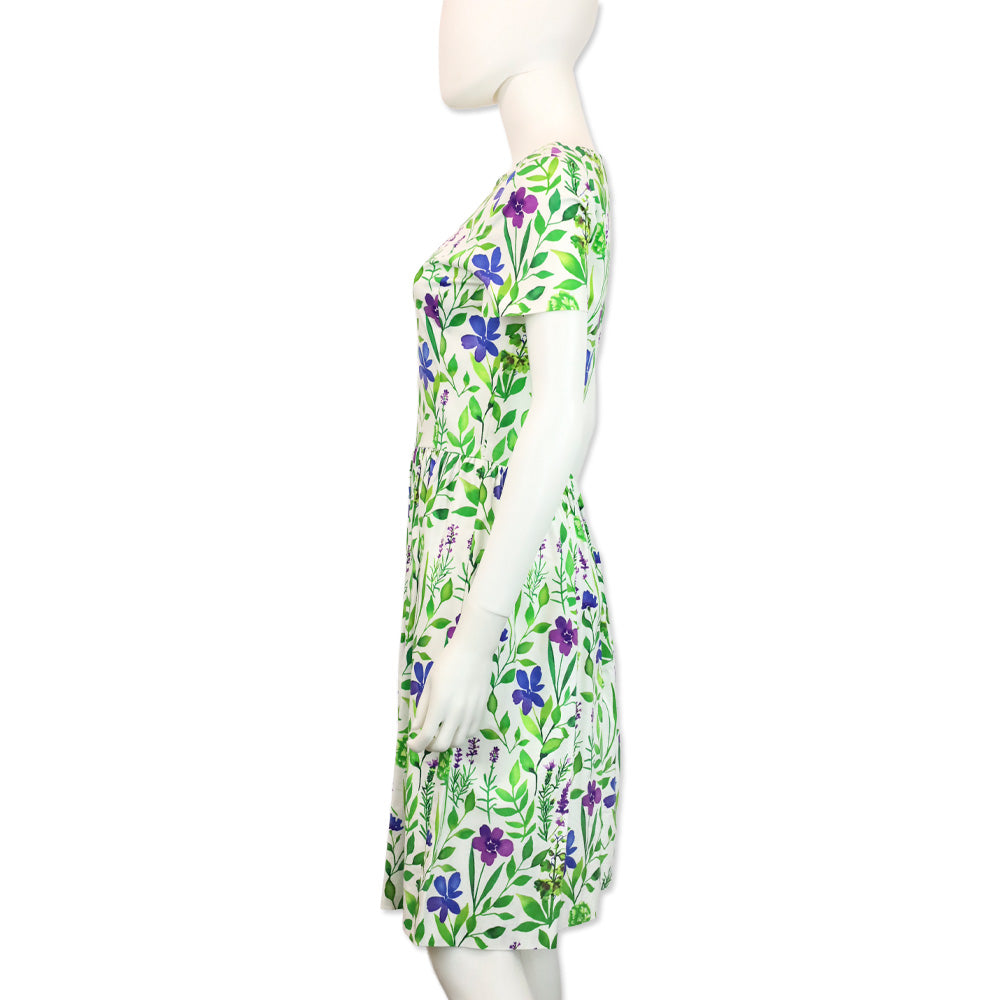Exude effortless charm in this Oscar de la Renta Floral Midi Dress. Made in Italy from a premium cotton-spandex blend, this dress features a vibrant purple and blue botanical print set against a clean white backdrop. The silhouette is masterfully designed with a round neckline, short sleeves, and a ruched waistline that leads into a voluminous fit-and-flare skirt. Complete with the practical luxury of side-seam pockets, this piece is a perfect choice for garden weddings, high-end luncheons, or sophisticated summer gatherings.