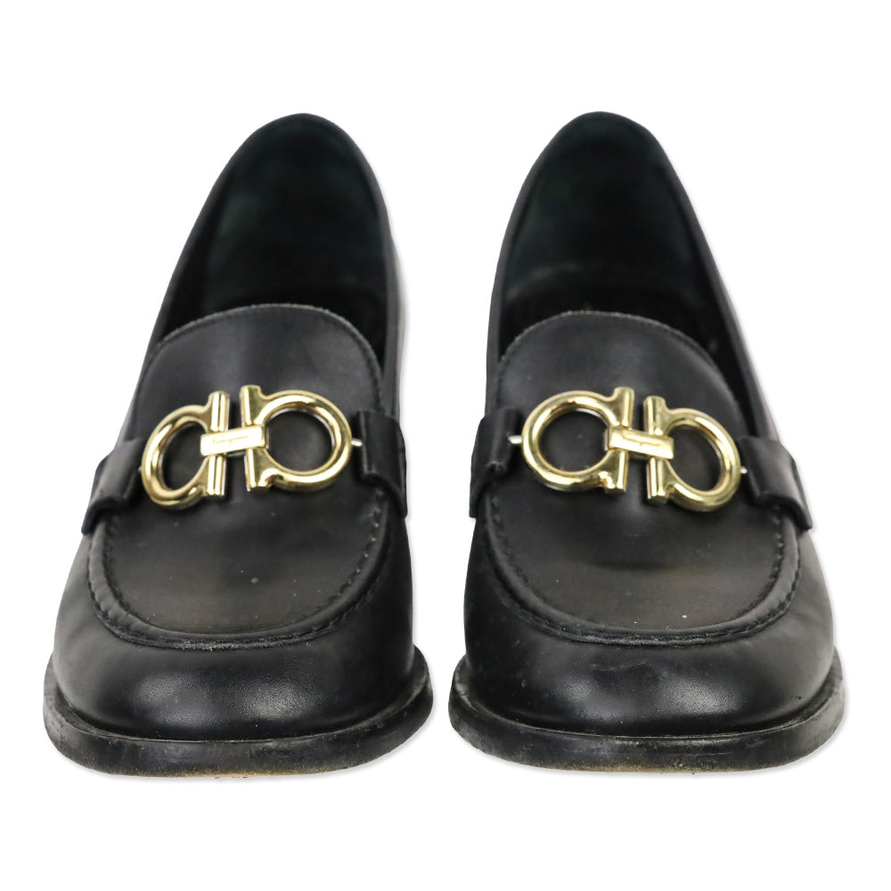 Salvatore Ferragamo Black Leather Gancini Buckle Chunky Heel Loafers