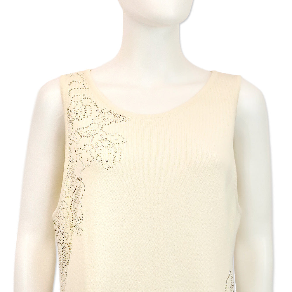 • Details: Sleeveless sheath silhouette; white knit with gold crystal accents; back zipper closure; midi length