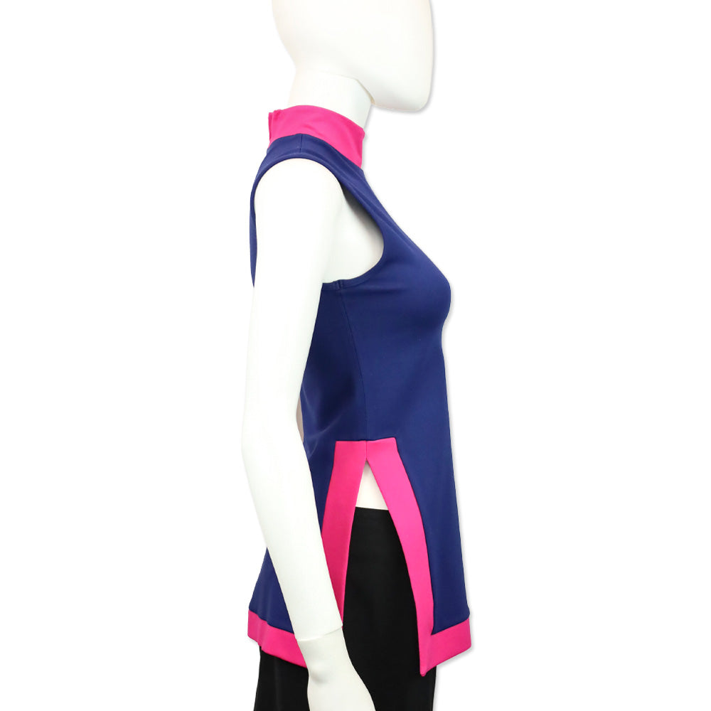 - Details: Mock neck collar; sleeveless design; deep side slits for movement; contrast pink trim against a deep blue body; pull-over style.